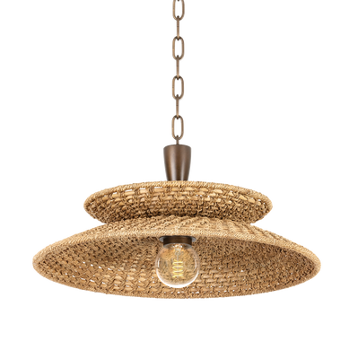 Two shallow shades are stacked in opposite directions to create the balanced artistry of this coastal pendant. The open weave of the natural abaca fiber shades allows light to filter through both sides, producing a dramatic visual effect. For the finishing touch, Landry dangles from a chunky vintage Gold Leaf chain. Available in two sizes.