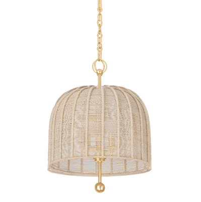 Lonnie rethinks the materiality of a classic umbrella-shaped shade. In this interpretation, the frame of the shade is wrapped in Bleached Abaca rope, allowing light to pass through. As a design detail, the Vintage Gold Leaf stem suspending the shade appears to pierce through the entire fixture, finishing in a decorative sphere. Lonnie is available in two sizes with 3 or 4 lights.