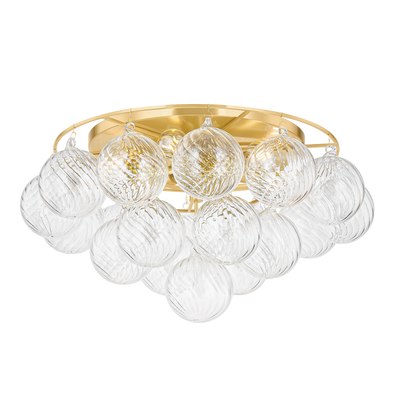 Swirl-ribbed or plated champagne glass globes dangle from an Aged Brass frame, creating this cloud-like showstopper.