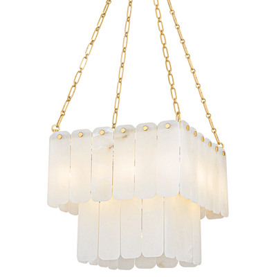 Inspired by Art Deco design, this grand chandelier features three tiers of lustrous cascading alabaster panels. Cool and milky when unlit, the subtly translucent alabaster comes to life with a warm glow when illuminated. Enhanced with Aged Brass finials and suspended from an elegant chain, Moissanite exudes an old-world sense of glamor. Make a striking statement in an entryway or large living room.