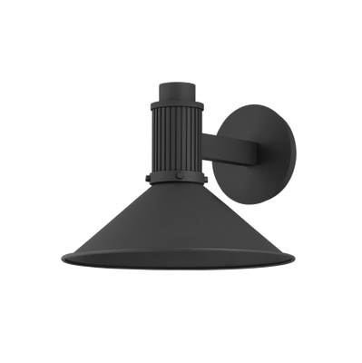 The RLM-inspired shape of Elani has been redefined for contemporary spaces with a highly durable and functional exterior design. Supported by a ribbed cap and circular backplate, the conical shade directs light downwards, illuminating entrances and walkways. An all-over Textured Black finish provides an industrial modern feel in keeping with the construction of the fixture. In two sizes, Elani is perfect for smaller-scale residential spaces.