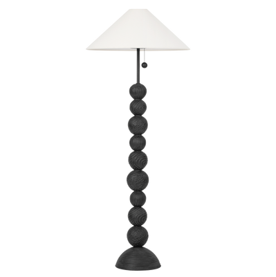 Miela conceptually aligns with folk art aesthetics. Incised spheres reminiscent of carved wood are modeled from Black Motif Ceramic, resulting in a striking, polished appearance. Miela is further enhanced by an oversized pull chain and frame finished in Forged Iron. The off-white linen shade introduces a clean point of contrast. *Due to the one-of-a-kind nature of the medium, exact colors and patterns may vary slightly from the image shown.