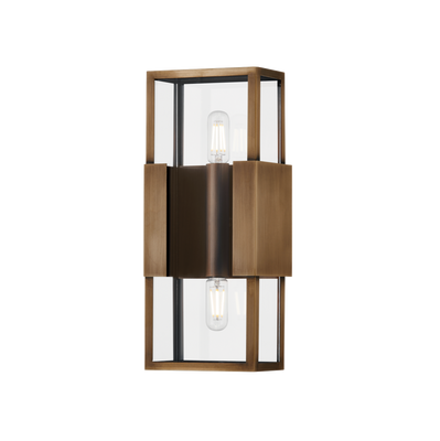 A refined interpretation of a vintage box lantern, Santa Clara focuses on maximizing the light and transparent feel of this piece while also celebrating the minimal Patina Brass metalwork. The flanges that extend from the backplate support the minimal glass box-like jewelry clasps. Available in two sizes featuring 2 lights each, as well as a 4-light version, this exterior wall light provides a warm welcome home.