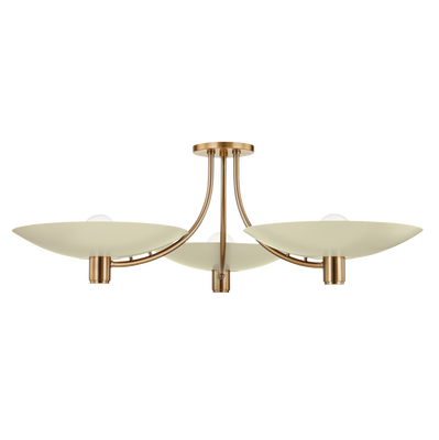 Taking inspiration from mid-century designs, Wolfe features updates in arm shape and finish combinations that give this chandelier a fresh look. Three circular disks in a Soft Sand finish balance on top of graceful arms finished in Patina Brass. Marrying clean geometry with elegant curves, Wolfe provides serene and even lighting from above.