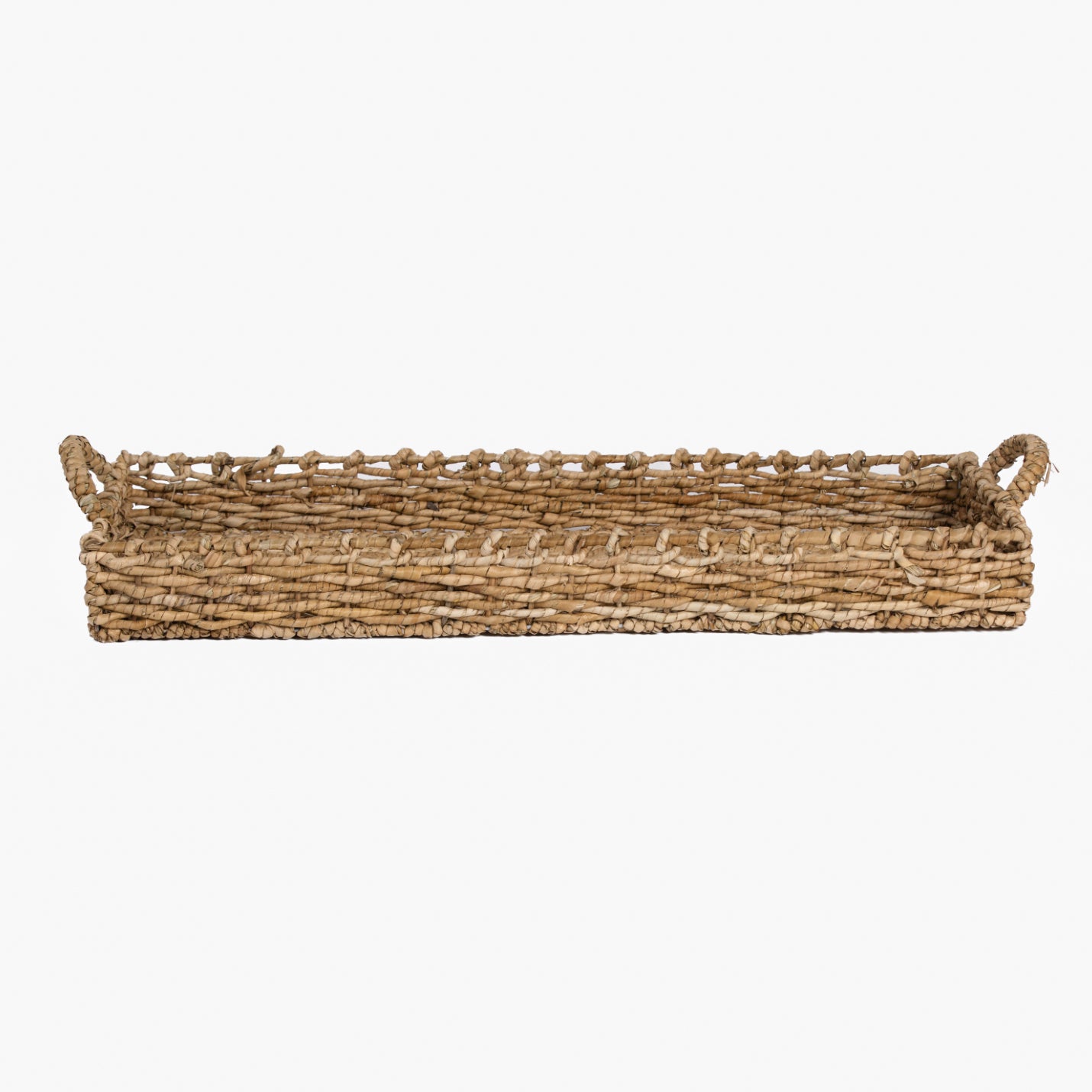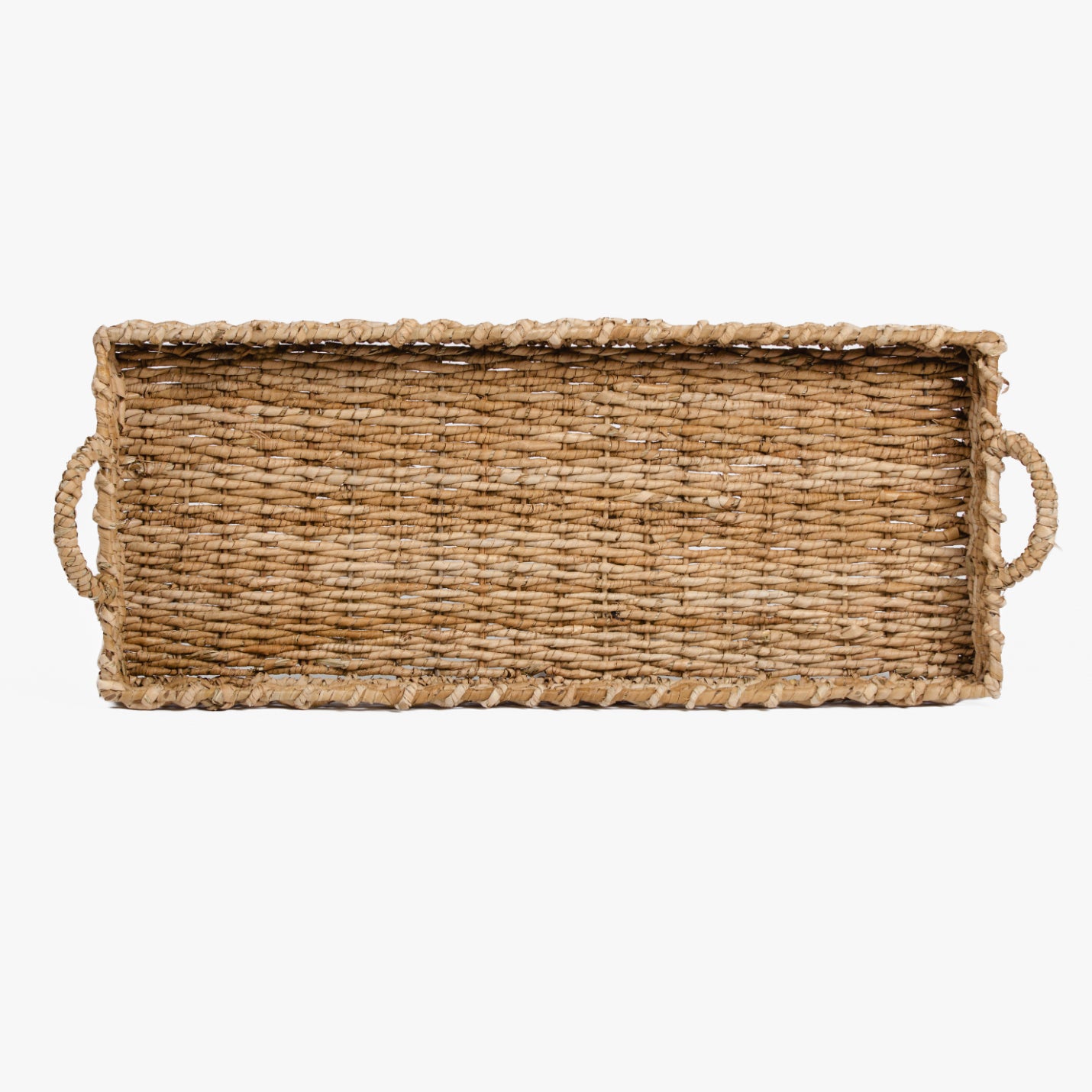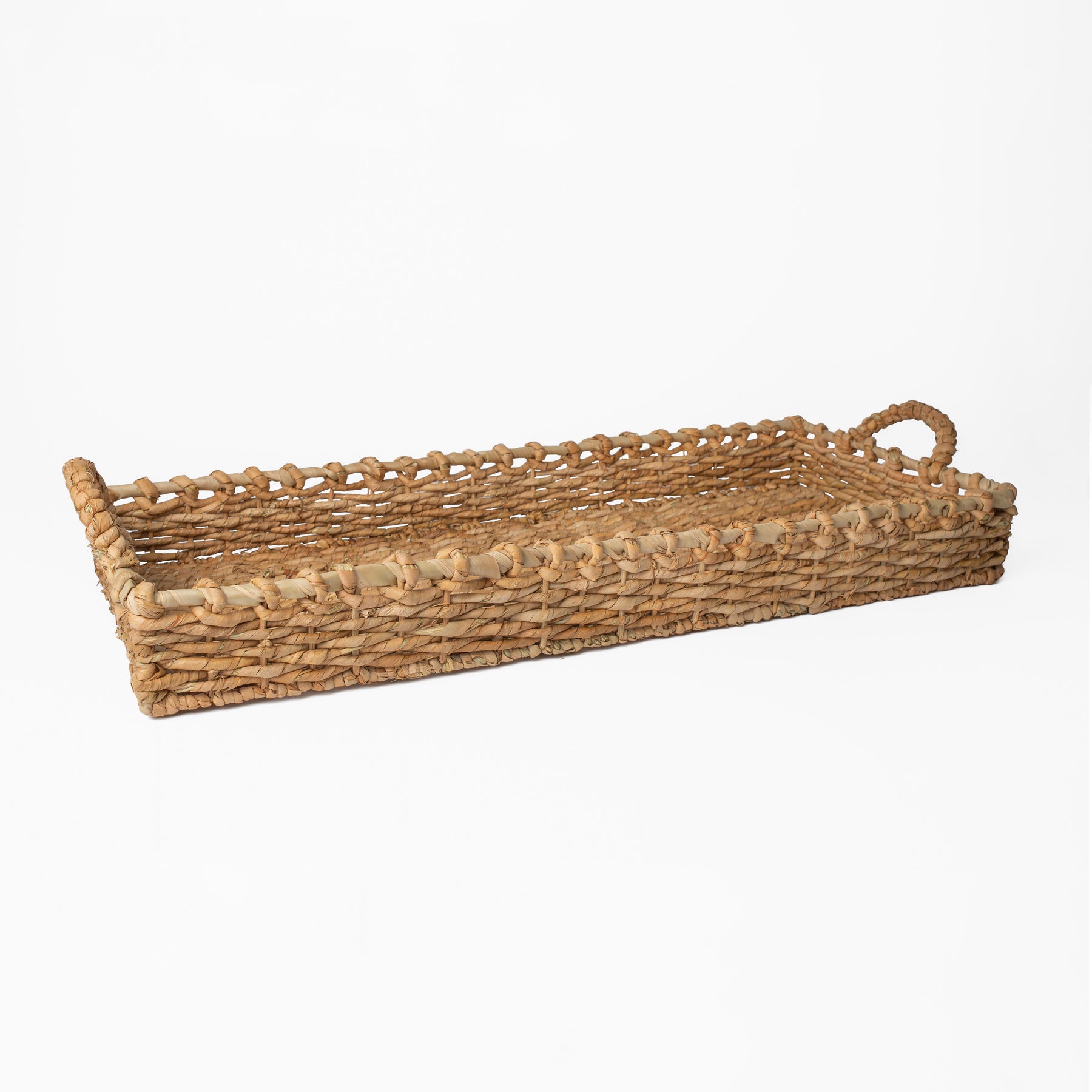 The handled seagrass tray is lightweight and functional. Use to hold linens on a bathroom shelf, for a tablescape, or set on an ottoman.