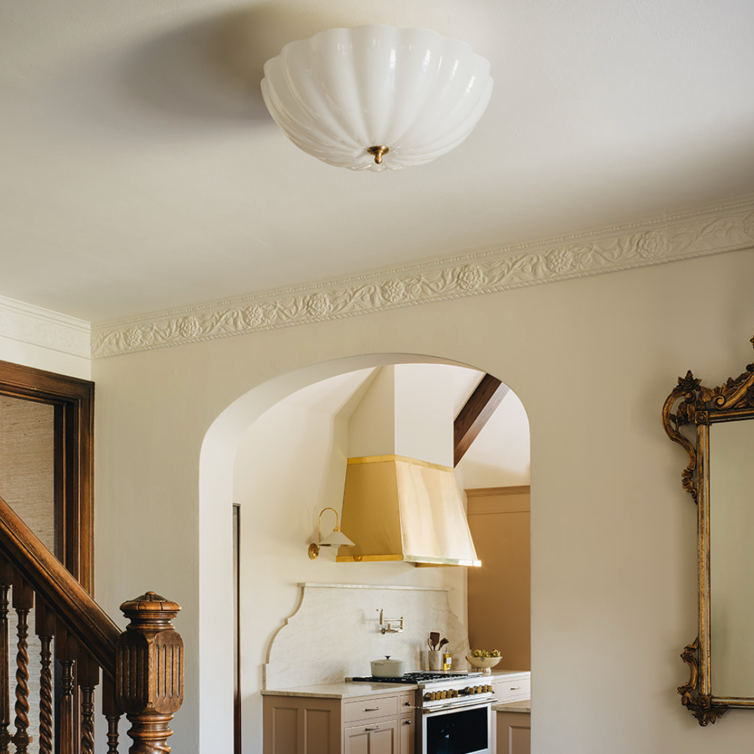 The Rosehill by AERIN exudes a subtle, feminine grace. Its minimalist design pairs scalloped white strié glass with understated metalwork in either polished nickel or antique brass. It emits a warm, inviting glow to minimalist spaces or period rooms.