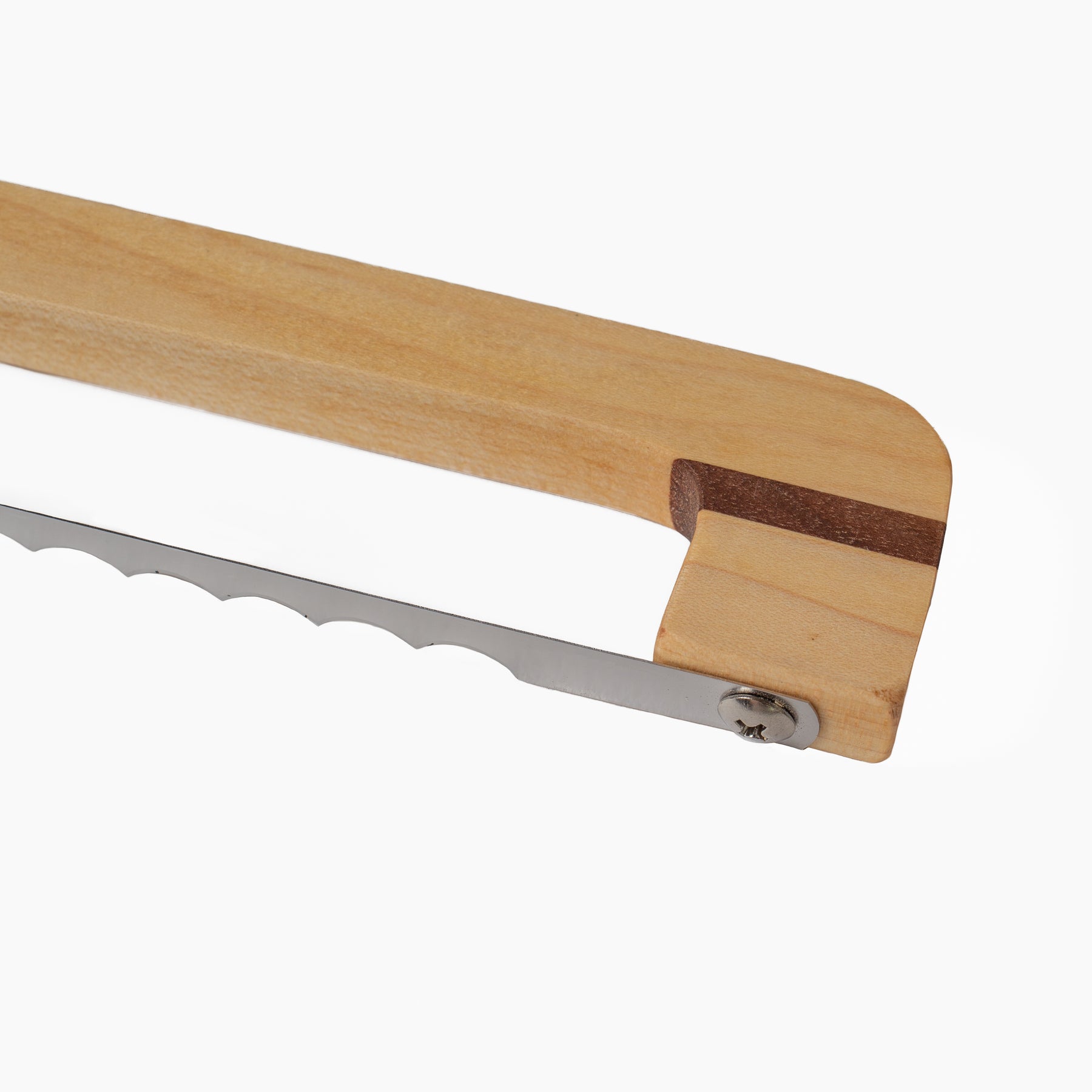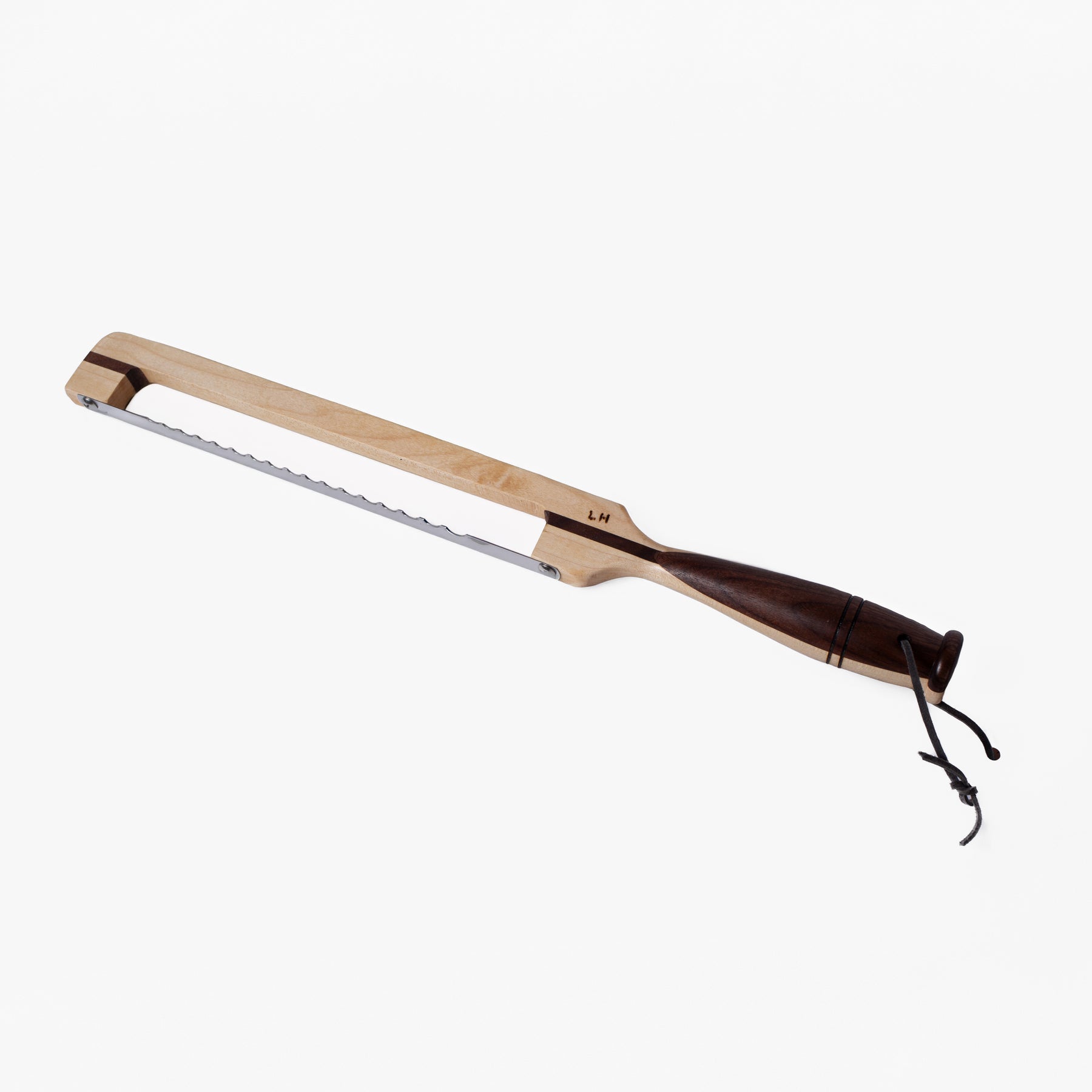 Locally made in Grand Rapids, this bread knite is beautifully crafted and made from contrasting maple and walnut hardwoods. The turned handle feels just right in hand, and the blade slices effortlessly through bagels and hearty loaves. Includes a protective cover for safe keeping.